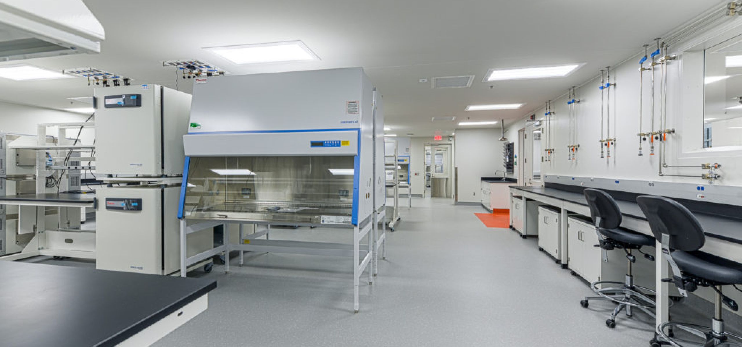 There was a significant amount of new infrastructure that was installed as part of the overall project. The new HVAC equipment included the installation of a new 27,000 CFM AHU, seven exhaust fans, a Bag in / Bag Out filter housing for the exhaust stream from the labs, and a number of automated dampers and other control items. The mechanical equipment installed includes a new DI system, HVAC chiller and pumps to backup critical loads, and new gas manifolds for the new CO2 and O2 gas distribution. The electrical infrastructure included a new UPS and ATS to support the new critical lab equipment being installed throughout the space.