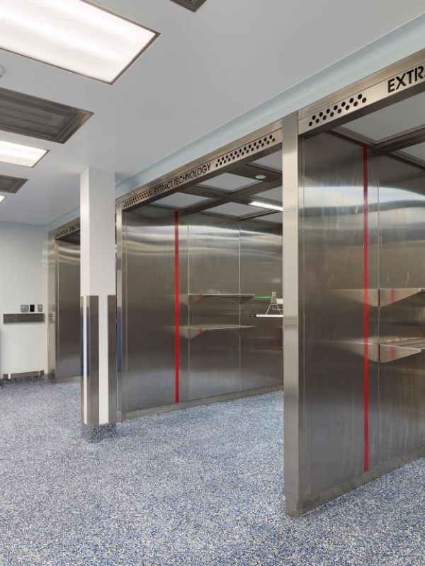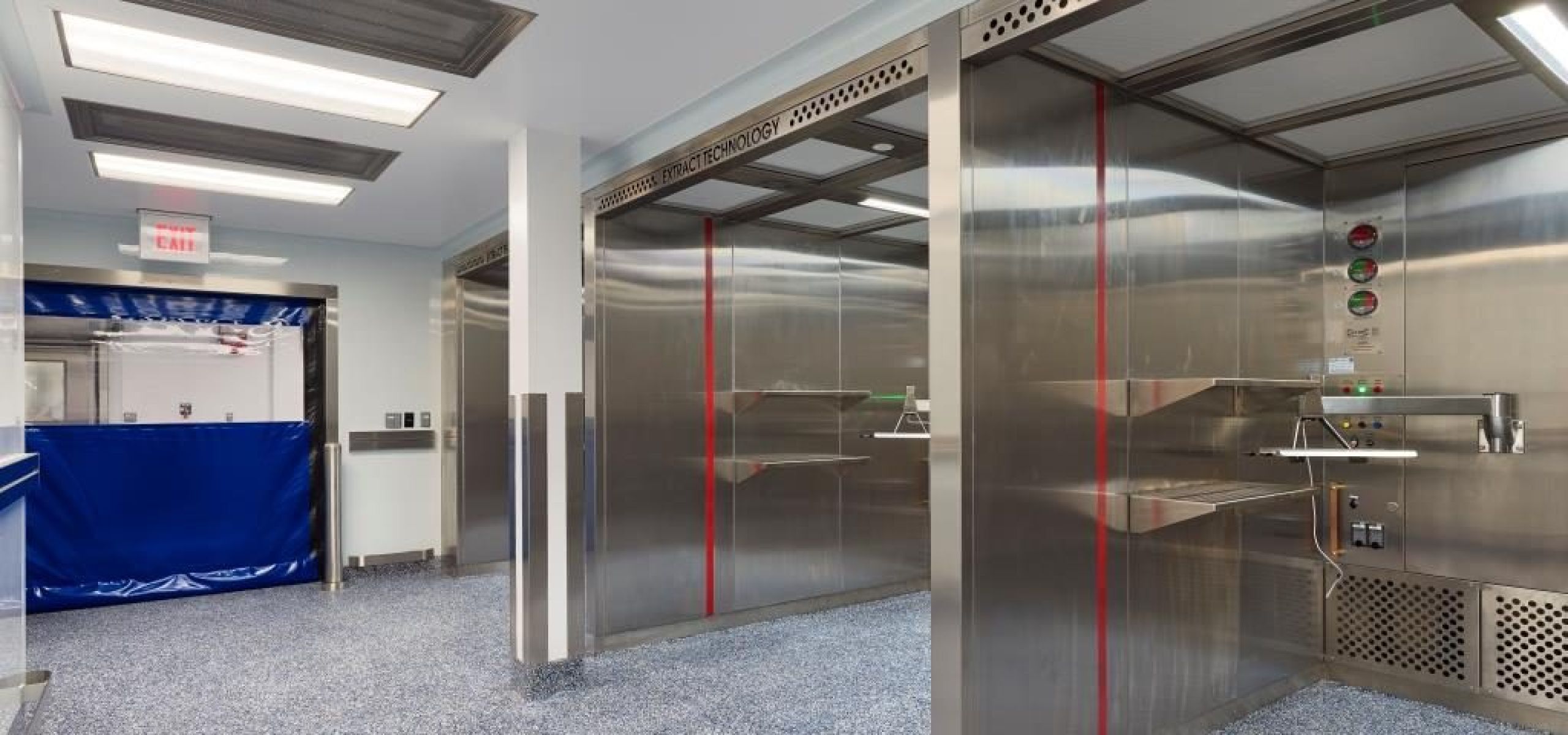 Phase 2 included installation of new Material & Personnel Airlocks, Chemical Storage and Weigh/Dispense Suite. The Weigh/Dispense Suite was purpose built with multiple down flow booths to accommodate specific products and personnel protection. Finishes within the Phase 2 suites matched those installed under Phase 1, including takiron walls, epoxy floors and epoxy painted ceilings. Additionally, a new 15,000 CFM AHU was installed during this phase to provide the necessary air changes to accommodate the program. The AHU installation included rooftop dunnage and platforms, along with new plant utility distribution.
