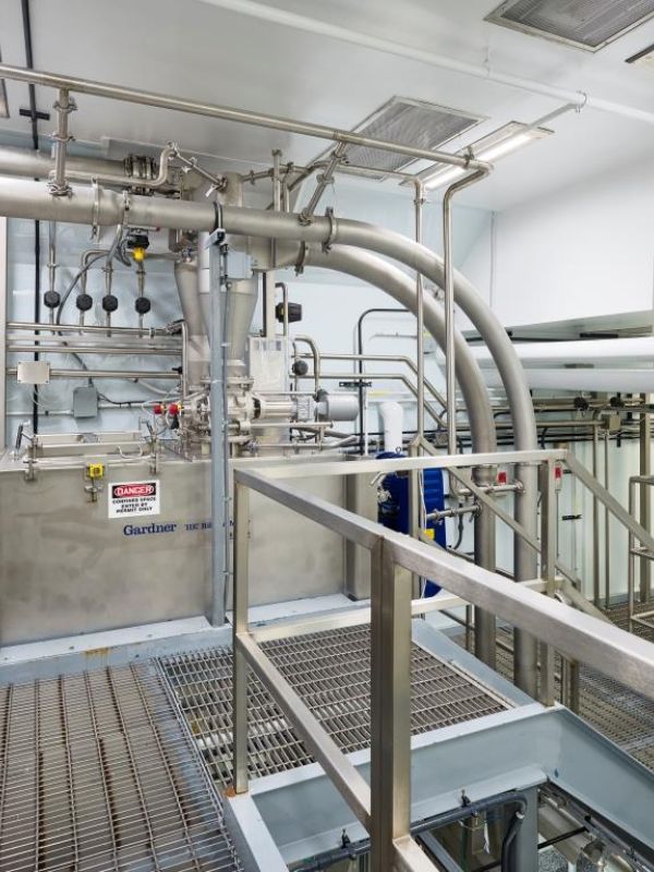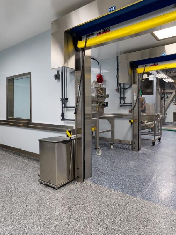Phase 1 included installation of new airlocks and high speed roll up doors to properly segregate the Powder suite. Additionally, the walls of the existing room were lined with heat welded takiron and a new epoxy floor installed to provide GMP finishes throughout the suite. Completing the finish work was particularly difficult due to the existing utilities exposed within the room that could not be removed (or recessed) without adding substantial cost to the project. New ductwork was installed during this phase to prep for connection to a new AHU to be installed under the future phases. New suites were also constructed to house pre-blending operations and a relocated CIP skid.